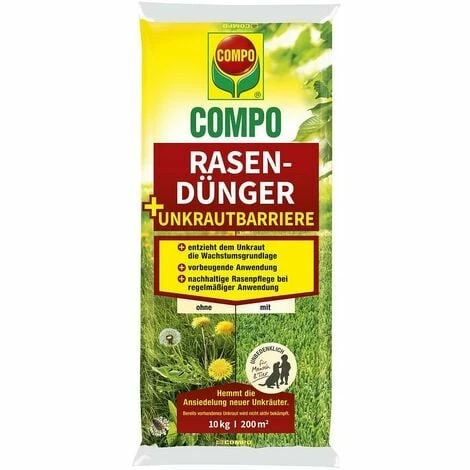 COMPO Rasendünger und Unkrautbarriere in einem Produkt. Ihr Rasen wird ideal mit Nährstoffen versorgt. Ein dichter Rasen, der regelmäßig vorbeugend gepflegt wird, kann sich konkurrenzstark gegen Unkräuter durchsetzen und entzieht Unkrautsamen im Rasen die Wachstumsgrundlage und wirkt vorbeugend gegen Unkrautwuchs. Unbedenklich für Mensch und Tier