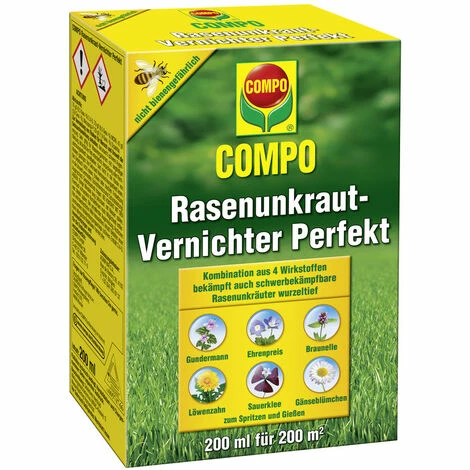 Compo Rasenunkraut-Vernichter Perfekt ist ein Rasenherbizid gegen zweikeimblättrige Unkräuter im Rasen. Das Mittel kann gespritzt oder gegossen werden und wirkt über das Blatt bis in die Wurzel, während die Rasengräser geschont werden.