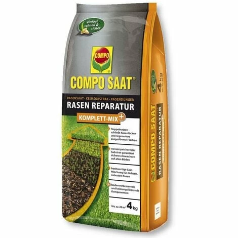 COMPO SAAT® Rasen Reparatur Komplett-Mix Plus erfüllt einen Doppelnutzen: Er schließt Rasenlücken und regeneriert ausgedünnte Flächen. Das Wasserspeichernde Substrat garantiert sicheres Anwachsen auf allen Böden. Die hochwertige Saat-Mischung im COMPO SAAT® Rasen Reparatur Komplett-Mix Plus sorgt für einen dichten, robusten Rasen. Mit dem Plus an bodenverbessernden und keimungsfördernden Komponenten.AnwendungsschritteStep 1Im Vorfeld der Rasenreparatur empfiehlt sich eine Bodenvorbereitung. Lockern Sie den Boden an den reparaturbedürftigen Kahlstellen des Rasens leicht auf. Entfernen Sie abgestorbenes Gras und ggf. vorhandene Steine, begradigen Sie mögliche Unebenheiten.Step 2KOMPLETT-MIX+ mittels der seitlichen Streuhilfe an der Schachtel gleichmäßig auf den zu reparierenden Rasenbereich ausbringen (Aufwandmenge ca. 400g/m²). Bei Anwendung auf strapazierten und ausgedünnten Rasenflächen ist es ausreichen das Produkt ausschließlich in einer feinen Schicht bzw. zwischen den noch bestehenden Rasengräsern ausbringen (Aufwandmenge ca. 200 g/m²).Step 3Die Basis des COMPO SAAT Rasen Reparatur KOMPLETT-MIX+ stellt das wasserspeichernde Keimsubstrat dar, es fungiert gleichzeitig als -Bewässerungsanzeiger-. Dobald sich das Keimsubstrat hellbraun verfärbt, muss – um die jungen Rasenkeimlinge feucht zu halten – erneut bewässert werden.AnwendungshinweiseAnwendungshinweis:Kultursubstrat zur einmaligen Anwendung im Freiland als Bestandteil eines Nachsaatproduktes für Fehlstellen im Rasen. Die Eigenschaften des Kultursubstrates ergeben sich erst nach ausreichender Bewässerung. Das Produkt ist mit Wasserüberschuss zu bewässern. Die Wasseraufnahme ist abgeschlossen, wenn das Granulat nicht weiter expandiert. Eine Nachdüngung ist nach frühestens 6 Wochen zu empfehlen.Anwendungszeitraum:Bei dauerhaften Bodentemperaturen ab 10° C zu verwenden.