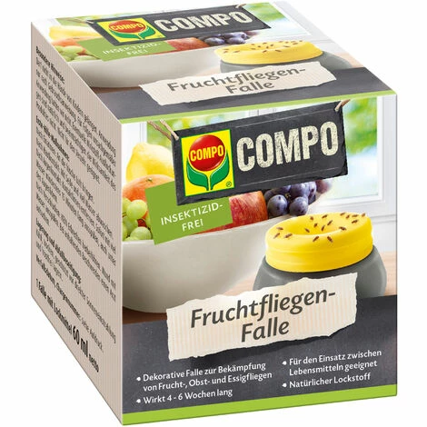 Besonders in Bereichen, wo Obst gelagert wird, können Frucht-, Obst- und Essigfliegen auftreten. Die COMPO Fruchtfliegen-Falle lockt mit einem attraktiven Duftstoff die Fliegen in die Falle, aus der sie nicht mehr herauskommen könnnen. Der Lockstoff ist insektizidfrei und kann ohne Bedenken in Lebensmittel-Nähe aufgestellt werden.